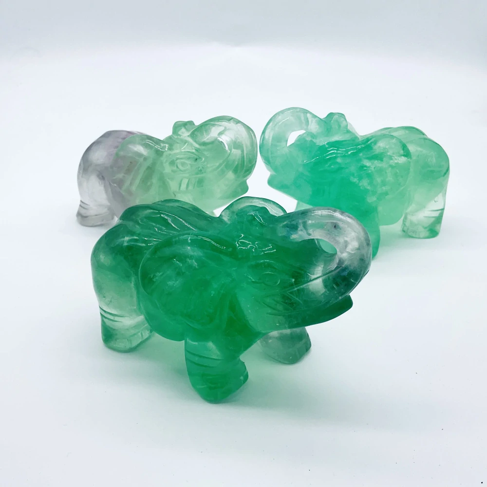 Tato řezba slona, vyrobená z prvotřídního fluoritu , představuje mocný symbol moudrosti, síly a štěstí. Přirozené pruhování a barevné variace činí každou křišťálovou řezbu zvířete skutečně jedinečnou a v každé křivce a detailu odrážejí umělecký dotek přírody.
