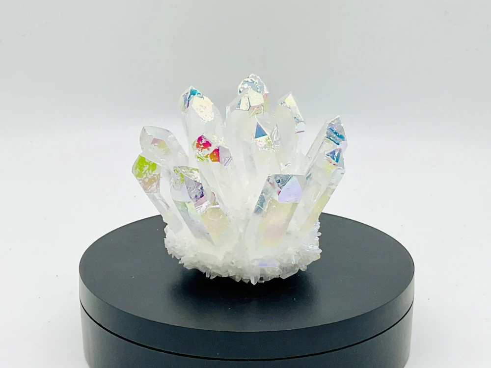 Dodejte svému domovu nádech mystiky s tímto krystalů Angel Aura křemene.Jedinečná a složitá forma křišťálového shluku z něj dělá poutavý kousek, který doplní každou místnost ve vašem domě. Tento přírodní minerál je ideální pro sběratele nebo jako promyšlený dárek pro každého, kdo oceňuje krásu krystalů