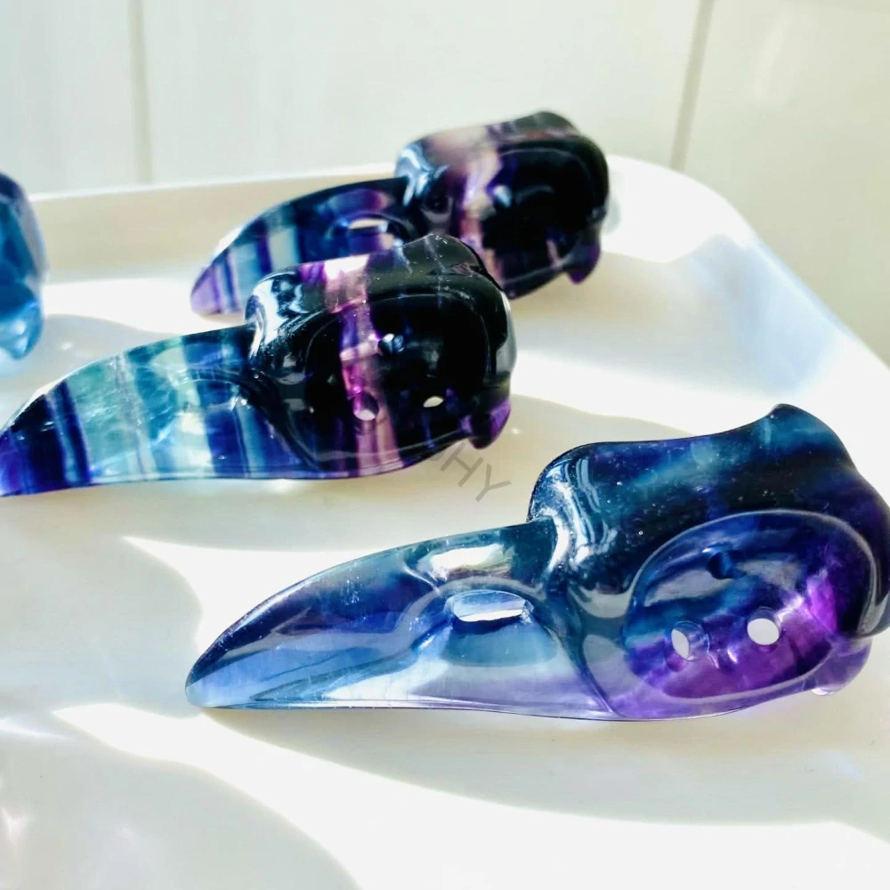 Na obrázku jsou ručně vyřezávané sošky v podobě ptačích lebek (nebo "plague doctor" masek), které jsou vyrobeny z přírodního minerálu fluoritu.