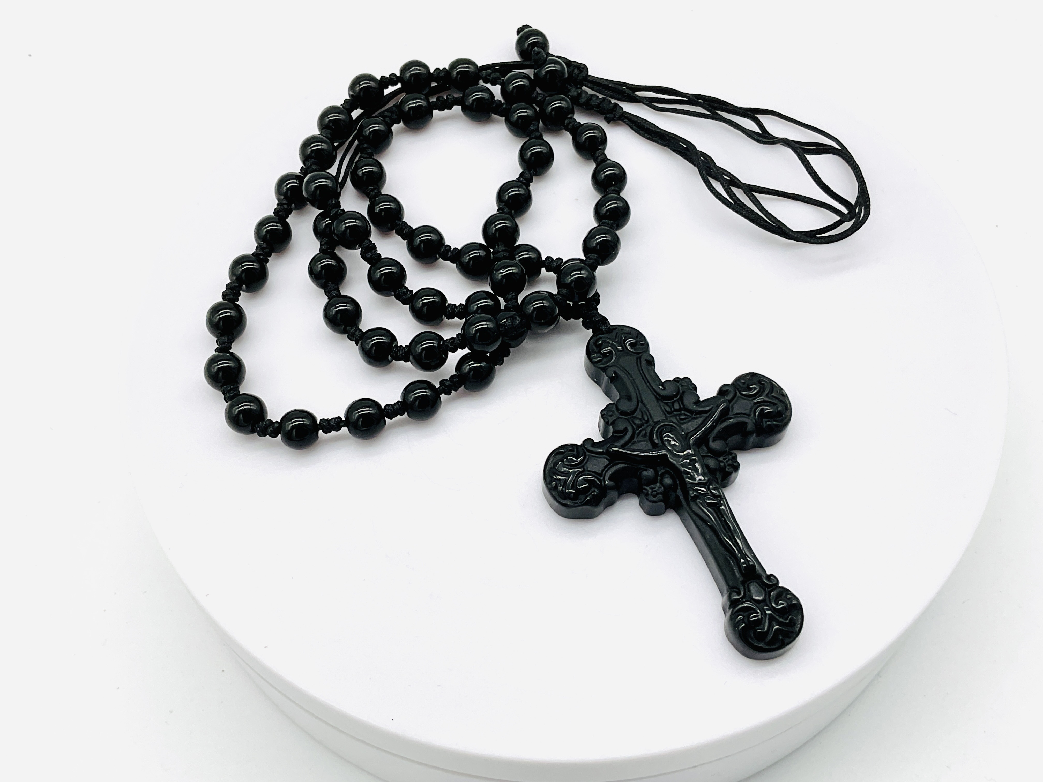 Náhrdelník z černého achátu (6mm)a křížku s Ježíšem z černého obsidiánu,nastavitelná velikost až 10 cm.
