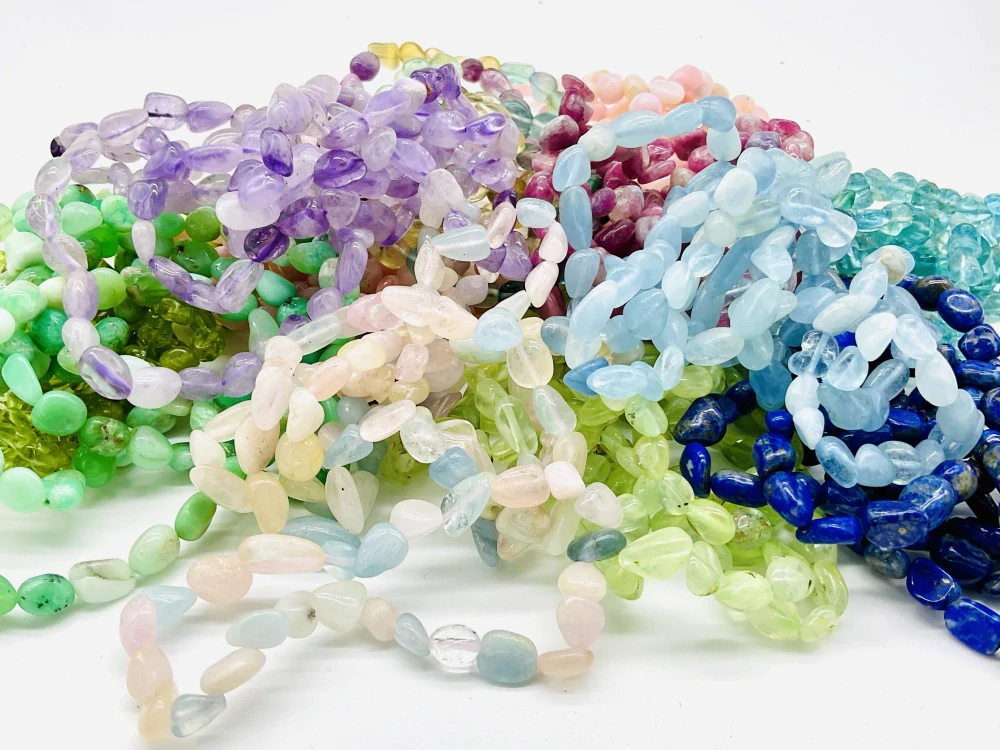 MIX různých druhů tromlovaných náramků. Balení náramků s velikostí kamínků 6x8mm obsahuje celkem 60ks náramků z těchto 11 drahých kamenů:Rubelit,Olivín;Chrysopras,Akvamarín,Opál růžový a Morganit,Lapis,Apatit modrý,Fluorit duhový,Prehnit a Ametyst lavender.