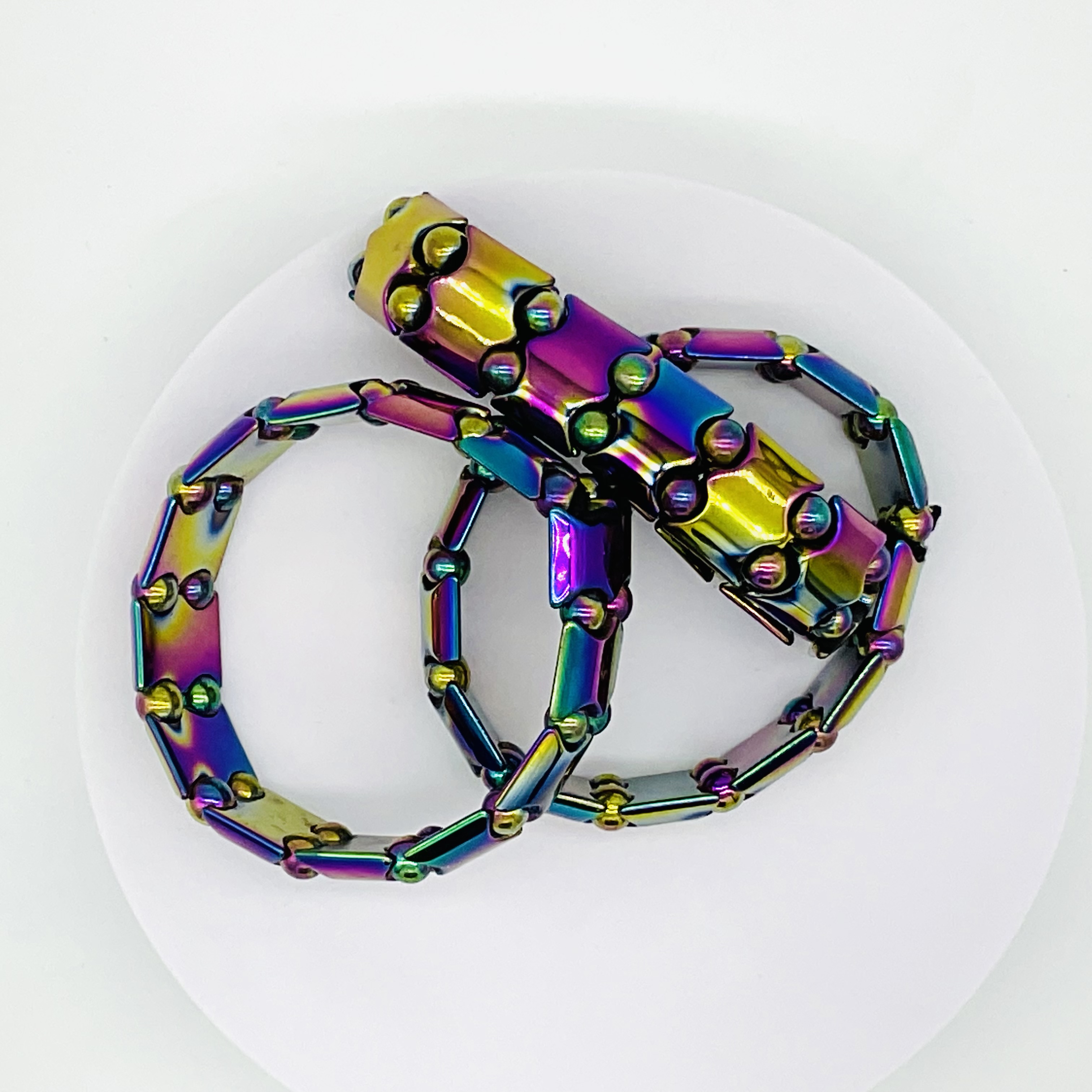 Náramek je pokovený galvanizací titanem. Náramek má všechny barvy duhy - od modré přes fialovou do růžovo-žluta a zelena, působí moderním až industriálním dojmem.Univerzální velikost.Šířka 17 mm.
