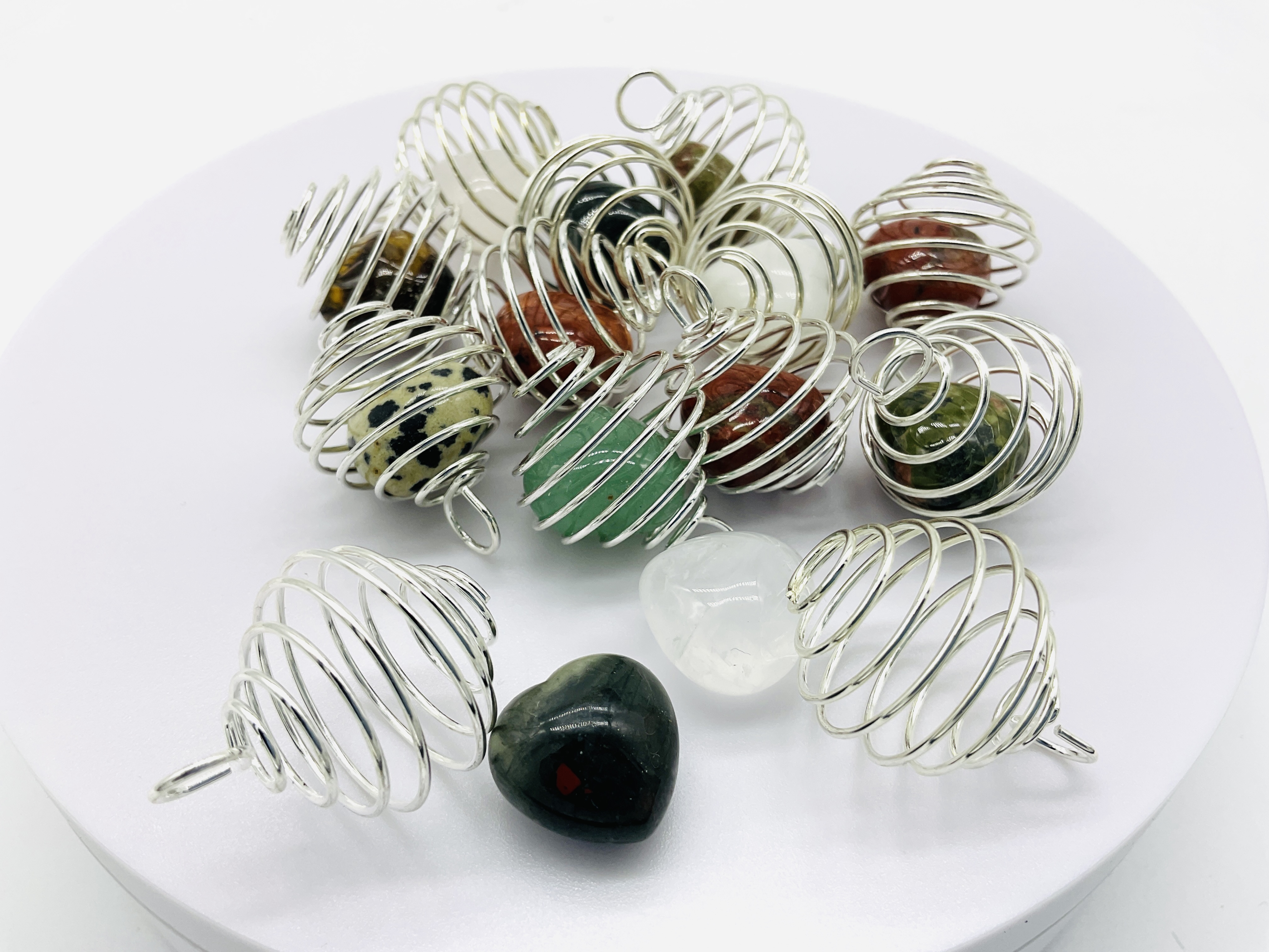 Klícky na přívěsky z pružného materiálu ve stříbřité barvě.Vkládáme do nich miniaturní krásná srdíčka z polodrahokamů.Černá kůže na zevěšení na krk samozřejmostí.