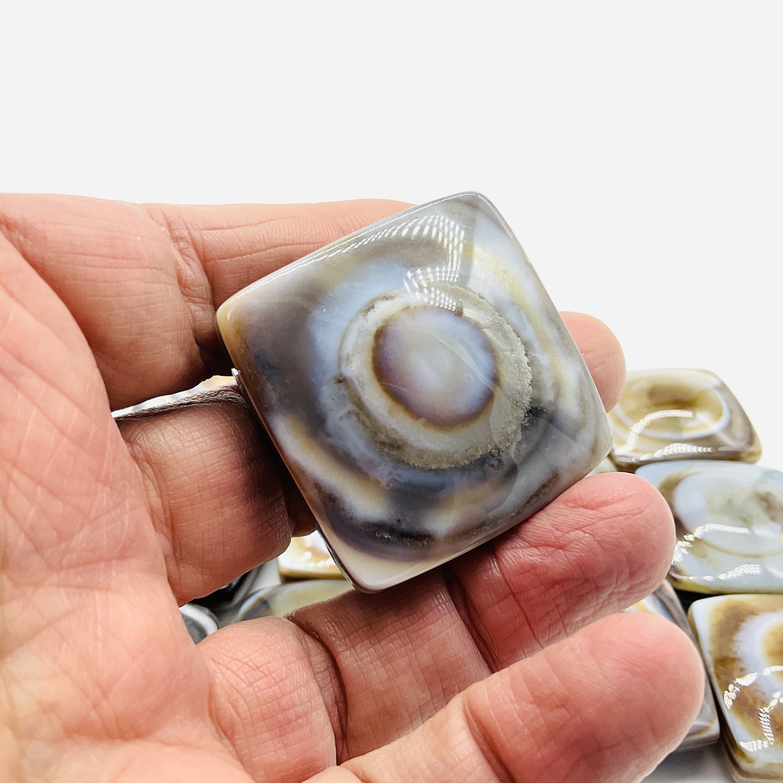 Achát šedý mírně vypouklý ve tvaru čtverce.Tyto acháty jsou z jedné strany provrtané,šířka otvoru 1,5~2 mm.Jsou vhodné k výrobě šperků.