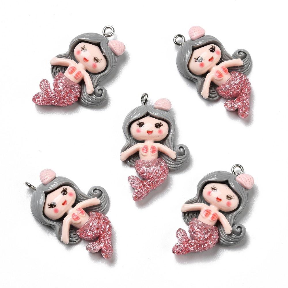 Neprůhledné přívěsky z pryskyřice, s třpytivým práškem a platinovými železnými smyčkami, mořská panna, stříbro .Velikost: asi 0,85 palce (21,5 mm) šířka, 1,38 palce (35 mm) délka, 0,24 palce (6 mm) tloušťka, otvor: 0,08 palce (2 mm).Řetízek 50 cm.