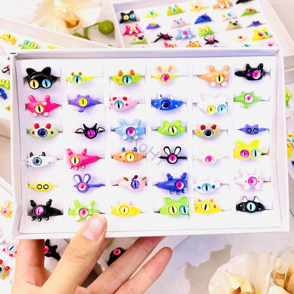 Prstýnky mají různé tvary a jsou zdobeny barevnýma očima.Jsou navrženy s otevřenou zadní stranou,což umožňuje nastavitelnou univerzální velikost vhodnou pro děti i dospělé.